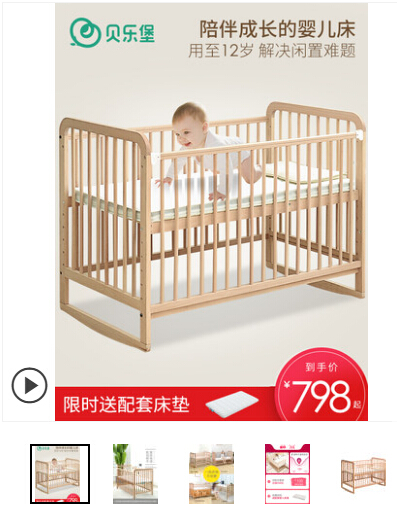 2、分析买家的需求 最重要的卖点以显眼的方式展示在主图上,你的买家是追求特价,还是追求品质,是要静音的,还是要功能多的,弄清楚这个,你的主图文案就不会出大错了。 我举两个例子: 第一个比如实木婴儿床,如果你的主图文案上有一句“陪宝宝一起长大的婴儿床”是不是很打动宝妈们的心呢?