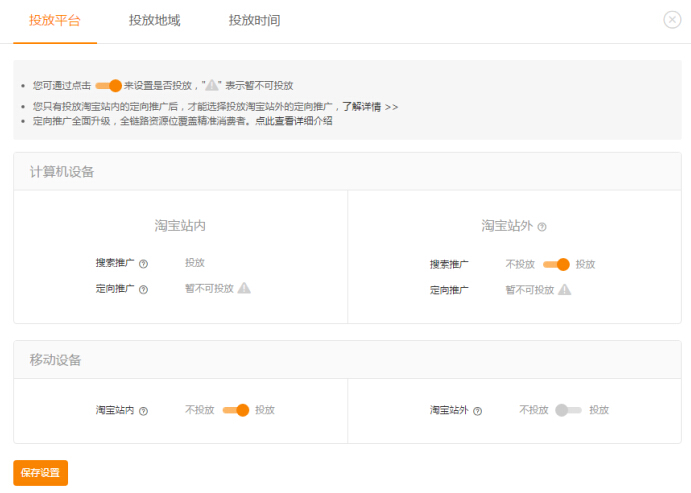 投放平台设置:只投站内,重点放移动端,电脑端为辅,因为现在是以移动端为主,基本每个人都一部手机,手机端的投放就是无线端的投放,无线端能触达的人群就更高