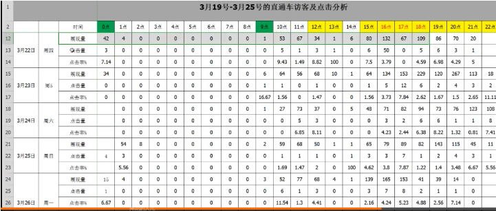 通过收集的数据汇成的表格,可以看出每个时间的点击和转化数据,根据这些数据,没有点击没有转化的不投放,有点击有转化的提高溢价。其项优化项也是一样收据数据做表格分析,以点击率为核心,一个词的点击率好坏判别,展现300以上,一张图点击率好坏判别展现1500以上。