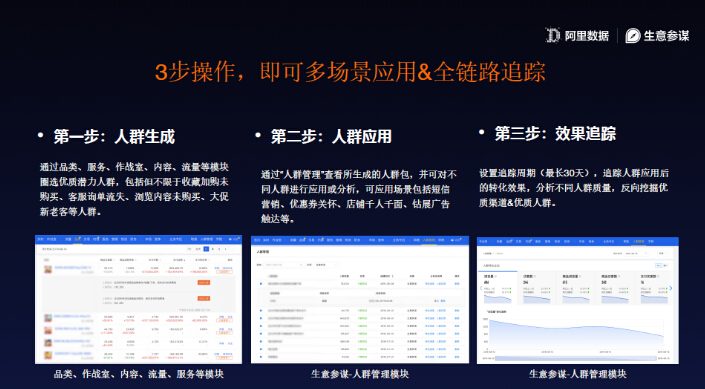第二个功能是,这些核心人群可以做全场景的触达,你可以给他投钻展,可以给他发短信,可以给他做优惠券,可以有店铺千人千面的不一样展示。