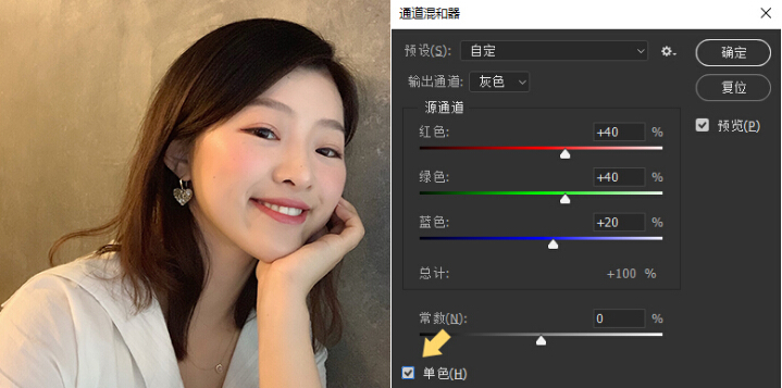 普通照片转黑白照的方法很多,这里安利一种好用且不破坏黑白对比的方法:选择菜单“图像>调整>通道混合器”,在弹出面板左下角勾选“单色”,只要保持红、绿、蓝的总和在100左右,参数默认也可,对比“去色”命令的效果图可发现,通道混合器做出的黑白效果更显自然。