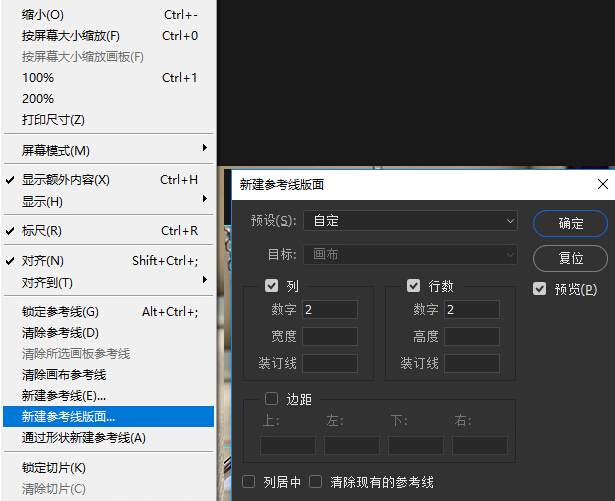 参考线快速寻找中心点:选择菜单“视图>新建参考线版面”,在弹出面板中勾选“列”和“行数”同时数值都填“2”,其他默认,点击确定即可。