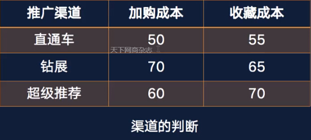 那怎么节省推广费?答案就是把钱花在刀刃上,按照加购成本和收藏成本的比例算出怎么分配渠道的预算比例,从而把钱都投入到效果更佳的渠道中。