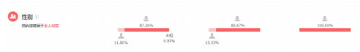 不同的产品面向的性别人群可能不一样。尤其是一些人群标签明显的产品。例如:女性内衣,啤酒这些都属于性别标签特别明显的产品,所以当出现人群错乱是一眼就能看出来的,但是针对一些性别标签不明显的产品我们看什么数据呢?去看未知占比