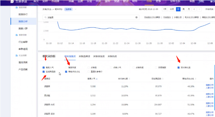 首先只打开搜索人气和在线商品数的数据,用在线商品数除以搜索人气,而且两者之间数据差距不要过大。一般1:10以内我们都可以接受,有些类目竞争太激烈的超出这个范畴我们也只能接受。其次,如果数据优质则再看商城点击占比和转化能力是否优秀。如果在线搜索人气低,在线商品数很少,但是如果搜索人气程上涨趋势,虽然转化率不高,那这样的有可能是我们潜在的神祠。因为获得流量的门槛很低,竞争也很小,这种词可能会成长起来,但也可能随时就死掉了,但是这样的词建议能选就直接选进来,我们不知道它什么时候能爆发,一旦爆发对我们是很大的机会,说不定我们的产品就直接做起来了,就算没有爆发,最了不起我们在优化一下标题就好了,对我们也没有什么损失。