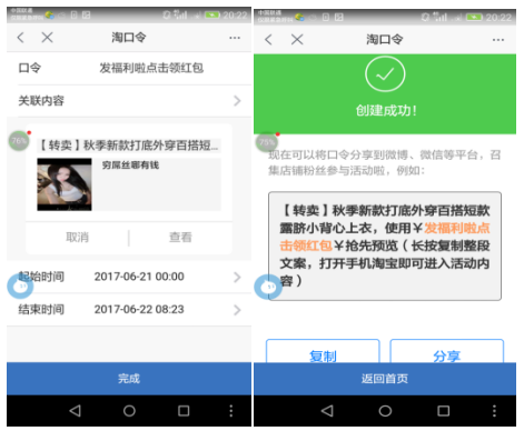 新建成功,这里我自己添加了一点创意,口令是“发福利啦点击领取红包”因为我自己平常喜欢在空间或者微博发点红包,所以我这么写会有很多朋友点击进来查看。我了解自己周围人群的特点,所以我进行了这方面的个性化营销。这个方法也可以用在自己的店铺里,清楚自己的店铺定位,这样做能更好的定位你的买家人群形成个性化。