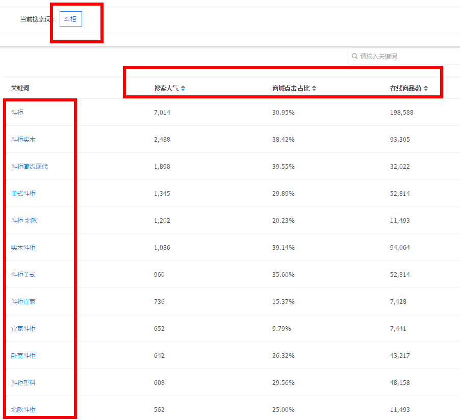 能搜索出好几个二级词,北欧我搜了不符合我们的风格,欧式也搜了也不符合,宜家是品牌我们不能用,塑料更加不符合了。所以我搜索了斗柜美式这个二级词。