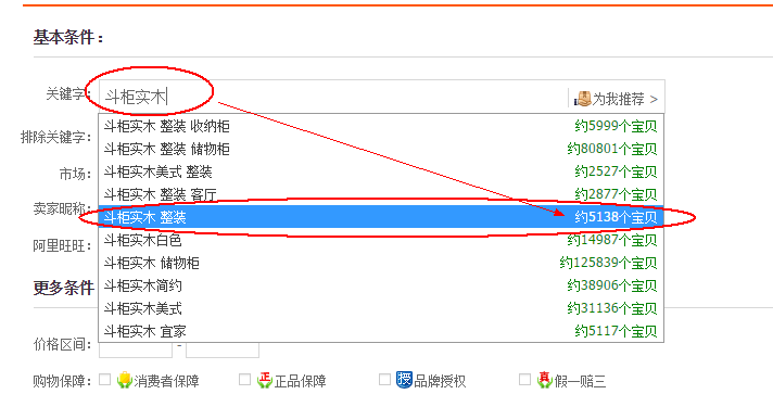 第三步找最佳三级词,再次搜索斗柜实木,我们可以看到下面有个竞争比较小的三级词,斗柜实木整装,只有5138个宝贝。这个词我们再去搜索里面查找是不是符合我们宝贝的词。