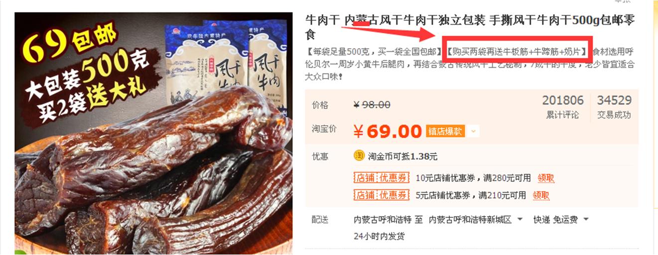 如果说送的赠品,最后能和店里的产品形成关联营销,那效果更好。如图4,买牛肉干送:牛板筋、牛蹄筋、奶片。买家收到包裹后,吃了赠品,如果口感是自己喜欢的,就会回来问客服,送的赠品可以买吗?
