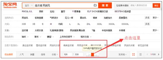 搜索“连衣裙 民族风”,然后看搜索结果页面的价格区间(PC端可以直接看到),无线端要点击一下“筛选”按钮。