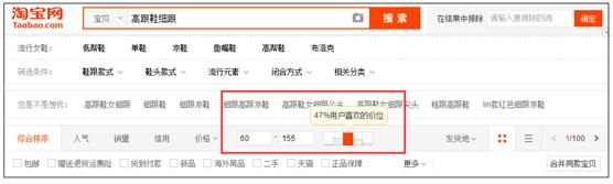 价格调整的范围问题——如果你的价格调整,跨越了价格区间,那么带来的问题就是:原来的价格所形成的销量,已经给你的店铺打标了,你的价格调整跨越了价格区间,这直接就意味着你的价格标签混乱。比如搜索“高跟鞋细跟”的时候: