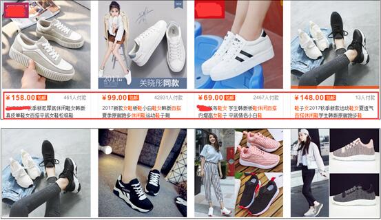 “休闲鞋”和“运动鞋”,尤其是女款,很多的宝贝标题中,都会同时有这两个关键词,但是大家同时去搜索一下这两个词:休闲鞋女 小白鞋、运动鞋女 小白鞋,你会发现出现的搜索结果页面,重复的商品非常非常的少。