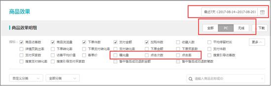 打开你的生意参谋——商品——商品效果——最近7天的数据,然后看PC端的数据(当然,你会告诉我,现在谁还看PC端的数据,都看无线端了好不好,但是你要注意,目前生意参谋无法把曝光量、点击次数这些数据表现出来,并且从整体效果上来看,你探查的是点击率,这是有一定的代表性的)