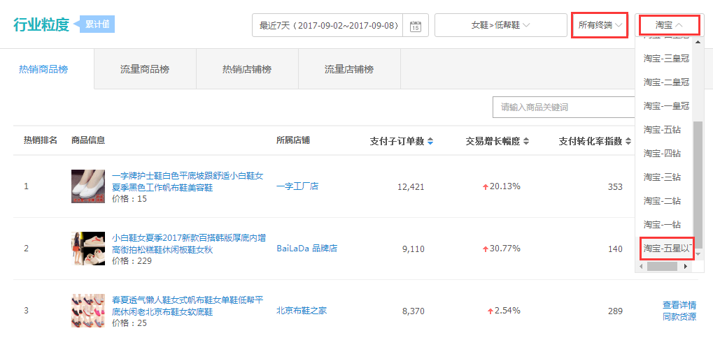 在这里我们首先要打开生意参谋通过市场行情找到商品店铺榜行业粒度这里,我们所需要,可能是最近七天的数据。因为只看一天的数据的话,那么会有很大的偶然性。而如果是去看30天的数据的话,我们所需要考虑的因素会有很多。所以七天的数据是最具有代表性的。