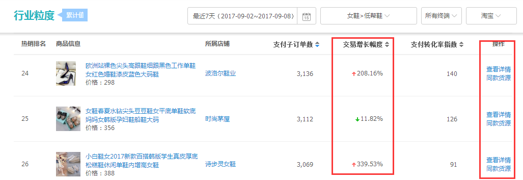 那么首先我们要去生意参谋里面,可以看到每一个商品后面都会有一个查看详情。,然后我们找到商品去点击,这里我们就需要去注意了。在选择商品的时候在差不多的条件下,我们要选择交易增长幅度高的。