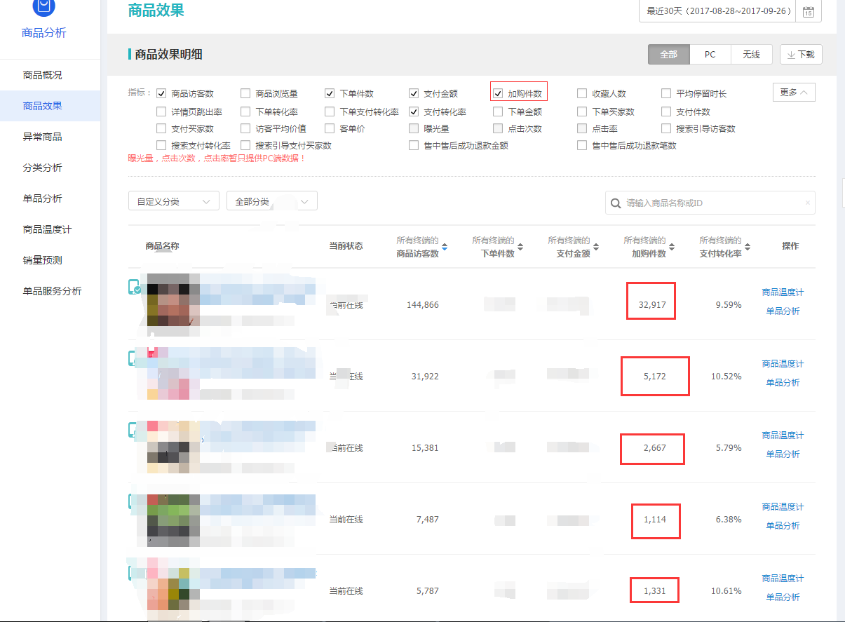 第三种,加购率,加入购物车的买家证明对商品的购买意图非常明确,可能是个人原因,后面购买或者是商品还差某一个小点没有打动她,离转化是非常接近了,那么通过这个数据我们同样可以分析出来他是否是潜在的爆款