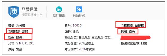 比如我红框里面的内容,都属于重要属性,一般还应该加上“适用年龄”,你原来的都是这种“街头风格”的,然后你上了一款学院风格的,那么这款宝贝就很难获得搜索引擎的扶植。