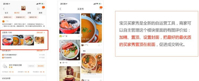宝贝买家秀是出现在宝贝评价页面的图片模块,商家可以自主管理这个模块里面的有图评价如:加精、置顶、设置封面,把最好的最优质的买家秀置顶在前面,促进成交转化。