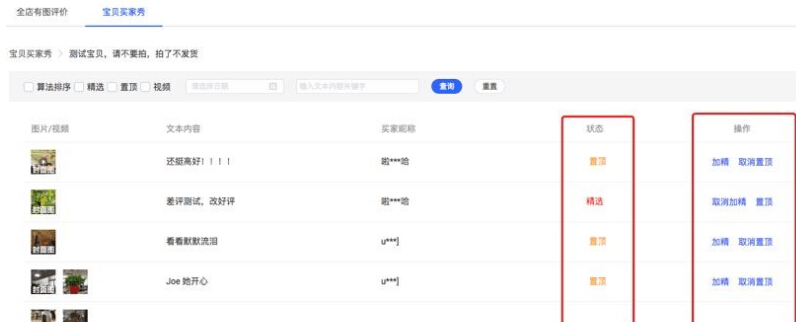 3.在宝贝买家秀管理列表里面,可加精、置顶、设置封面这个宝贝下的所有有图或视频评价