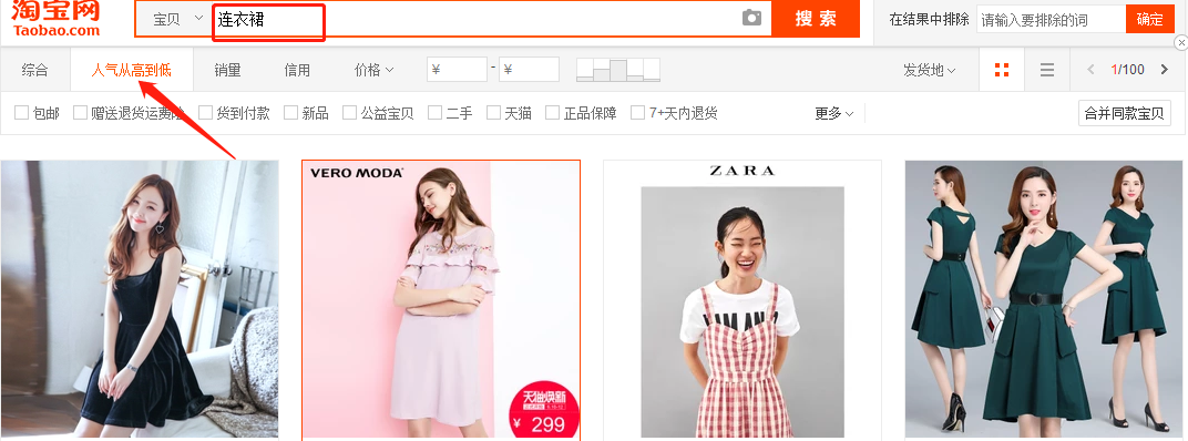 为什么这里要用人气排序,给大家解释一下为什么不用销量排序。因为销量可能是有多种渠道组合起来的销量(比如:活动做起来的,或者淘宝客做起来的,或者说是做直播做起来的,或者是靠前期低价促销做起来的,或者是粉丝店铺靠老客户做起来的)所以说销量排序,不能说明这是潜力款。那么我们用人气排序,就是主要找到大众喜欢的产品款式。
