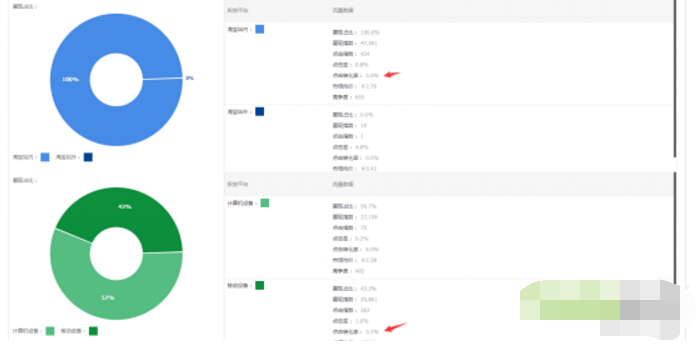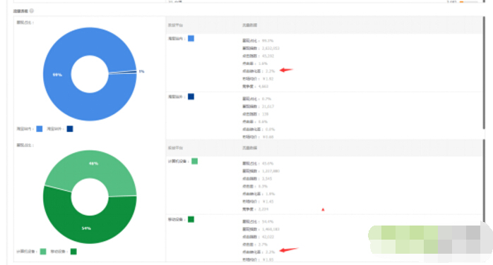 流量解析工具里面主要看两个指标:一个是淘宝站内的支付转化率为2.2%,一个是移动设备端的支付转化率也是2.2%,所以我们可以确定我们详情页转化率的标准为2.2%。