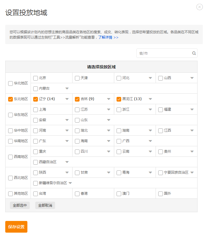 我们打开一个推广计划,在计划的页面上有个设置投放地域,这里的地域设置有什么样的作用。我们来打个比方,比如说,我是做服装类目的产品,比如说8月中旬,你要推广秋装的长袖衣服了,掌柜是南方人,按理来说我们现在是夏天是非常热的,这个时间我们穿的肯定也是短袖。但是你现在要做秋装的衣服,你该如何选择地区,如果你选的是全国的或者南方的话那么恭喜你,你直通车点击率不但上不去,而且转化还非常的差,原因是在这么热的天气情况下,买家可能会搜索秋装的衣服,但是他的购买意向是非常差的,他们只是想看看接下来秋装有什么好看的衣服,由于考虑天气的问题,还是会放弃购买的想法,毕竟都是需要花钱的。那么我们该选择那些地区呢?这里来帮大家如何分析地域需求。