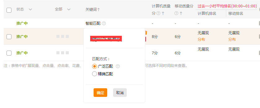 当我们的鼠标移到这个词上的时候,在这个这词的后面会出现几个小图标,我们点击第一个像瞄准器一样的图标,点开之后会出现这个词的广泛匹配和精准匹配。我来给大家解释这个两个匹配的作用,广泛匹配就是前面的说的,在你推广的这个词下,如果买家搜索的词中包含了你的这个词或者相关的情况下,也是可以搜索到你的这款商品。也就是说,你的词推广词是“衬衫女碎花”买家搜索了“衬衫女碎花修身”也是可以搜索到你的商品。如果说“衬衫女碎花修身”这个词表现不好的话,那他是会影响你的商品的质量分,或者说会扣你更多的直通车费用。这些我们也是可以避免的问题,所以说我们确定一个词的数据好的情况下,我们选择只需要选择精准匹配就可以了,精准匹配也就是只会展现你要推广的词,这样也不会浪费更多的无效点击费用和影响你的质量分。