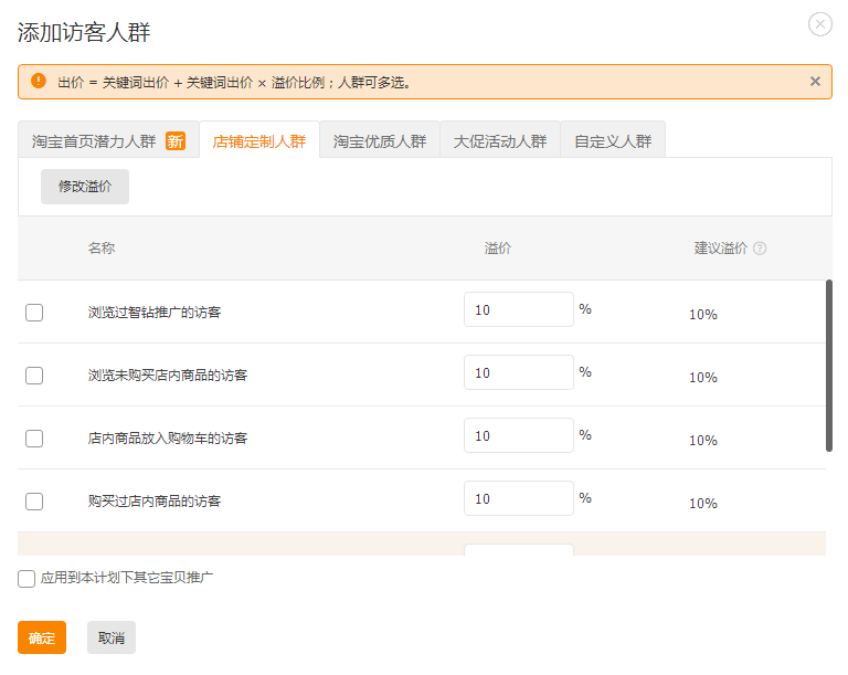这里首先要注意的是人群溢价,很多掌柜没有搞清楚溢价的问题,会设置的很高,不但没有效果而且扣费扣的非常多,原因是在之前的宝贝计划中,我们已经有了一个扣费标准,而这里的扣费溢价比例是需要叠加在一起,最终扣费=关键词出价+关键词出价*溢价比例,也就是,没有设置溢价之前的扣费是2元,如果我设置的溢价比例是100%,那么最终的扣费是4元,这样的话就相当于一个点击扣费增加一倍,其实能提升你的宝贝排名,但是不表示排名靠前了效果就很好了,溢价扣费也是要注意的一个地方。我们可以通过淘宝推荐的人群选择性的提高溢价设置进行推广,在不知道这个词好不好的情况下,我们可以通过测试的方式来分析数据,最终留下数据好的推荐人群,测试比例建议是20%-50%,不用太高。