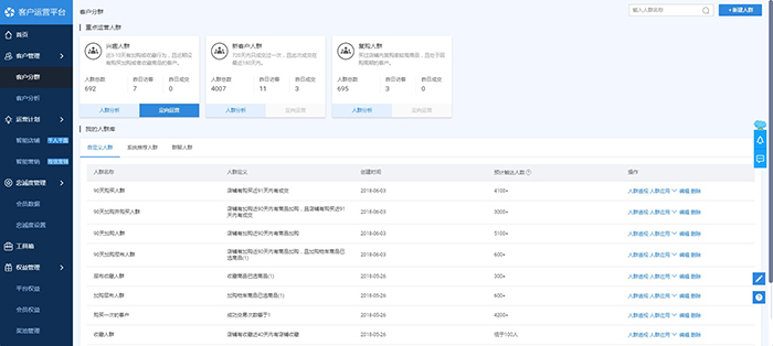 那么我们就可以利用客户运营平台的客户分群来进行一段时间的监控,可以记录一下客户的使用时间去分析观察我们的老客户的使用情况去定期发优惠券给老客户,比如,掌柜卖的是纸尿裤,那就可以从客户收货的那一天开始单独把这些客户添加到客户分群里面进行观察,一包纸尿裤的使用时间一般大概是半个月左右的样子吧,那么在客户差不多把纸尿裤用完的时候,我们就可以发一些店铺做的一些活动优惠情况发给老客户,如果产品给客户的一个使用情况很好,还发老客户专享活动优惠的前提下下单的概率我想一般都是比较高的,因为大多数客户都比较喜欢占小便宜嘛,只要你的产品给客户的体验够好客户有这样的一个需求,恐怕想不购买都不行吧。