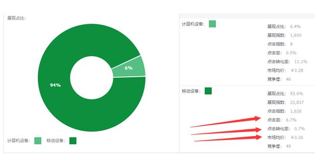 在这个关键词数据透视里面可以看到每个省份的展现排名和数量,我们可以利用这些来优化我们的地域投放。再往下可以看到这些关键词的核心数据表现,比如PC端和手机端的展现占比、市场出价、点击率等数据。